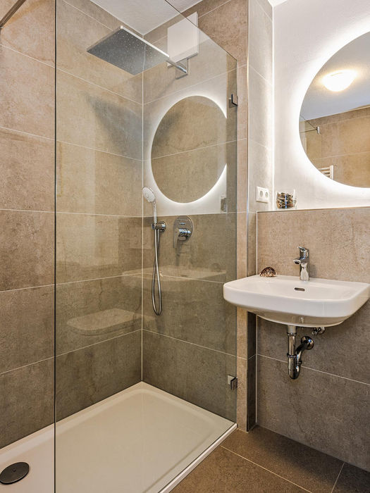 Walk-in-Rainshower-Dusche, WC, Waschtisch sowie einer Waschmaschine ausgestattet – praktisch und stilvoll zugleich.